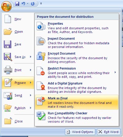 Trước khi chia sẻ một file phiên bản cuối cùng với người khác, bạn có thể sử dụng lệnh Mark As Final để xây dựng tài liệu chỉ đọc và truyền thông với người khác. Khi một tài liệu được đánh dấu là phiên bản cuối cùng thì việc đánh, soạn thảo các lệnh và dấu kiểm chứng bị vô hiệu hóa. Người quan sát tài liệu không thể vô tình thay đổi tài liệu. Các lệnh Mark As Final không phải là một đặc tính bảo mật. Bất kỳ ai cũng có thể sửa tài liệu được đánh dấu như tài liệu cuối cùng bằng cách tắt Mark As Final.