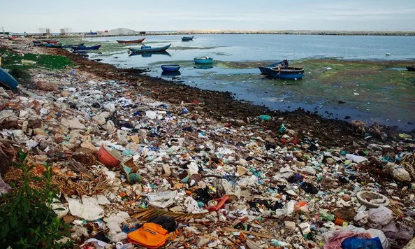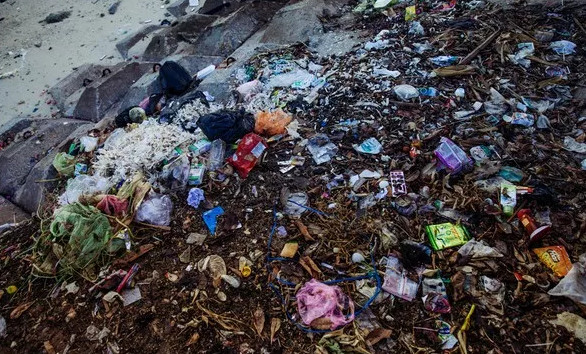 Rác thải ngập đầy sát mép nước biển.