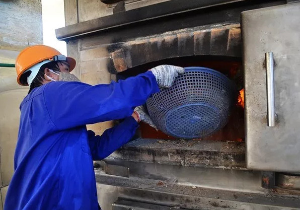 Nhà rác xử lý chất thải rắn linh hoạt được đầu tư trên 30 tỷ đồng nhưng công nhân Nhà máy phải dùng rổ nhựa để đưa rác thải vào lò đốt. (Ảnh: Lao Động).