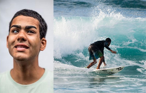 Derek Rabelo, không phải là một người lướt sóng bình thường. Chàng trai 20 tuổi người Brazil này sinh ra đã bị chứng tăng nhãn áp bẩm sinh, nhưng bệnh tật không ngăn cản anh học lướt sóng khi mới 3 tuổi.