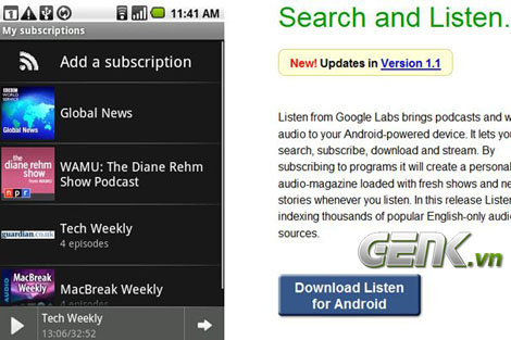Google Listen là giải pháp dành cho những người hay phải di chuyển, không có nhiều thời gian theo dõi tin tức qua hệ thống RSS. Ứng dụng này sẽ tạo ra một playlist tin tức dạng audio với các bản tin về lĩnh vực yêu thích của người dùng. Từ đó, bạn có thể lắng nghe chúng mọi lúc mọi nơi.
