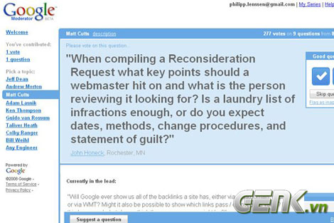 Nếu đã từng tổ chức các cuộc họp trực tuyến, hẳn bạn sẽ dễ dàng nản lòng bởi hàng loạt ý kiến được đưa ra cùng một lúc, chẳng ai nghe ai và cuối cùng là vấn đề cần giải quyết thì vẫn nằm ở con số 0. Vậy công cụ Google Moderator sẽ giải quyết vấn đề này khi bạn có thể sắp xếp ý kiến của mọi người theo thứ tự; sau đó người tham gia sẽ bầu chọn cho các câu hỏi/ý kiến được đưa ra để người khác có thể theo dõi một cách tiện lợi nhất.