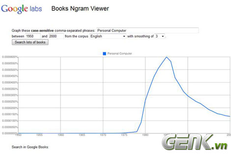 Ứng dụng này sẽ giúp bạn biết được tần số mọi người sử dụng các từ ngữ khác nhau như thế nào. Hơn thế nữa, Book NGram Viewer còn cung cấp các trích đoạn từ vài nguồn đáng tin cậy để người dùng có cái nhìn rõ hơn về văn cảnh từ đó được sử dụng. Biểu đồ bên dưới thể hiện tần suất mọi người sử dụng cụm từ “Personal Computer” (máy tính cá nhân) từ năm 1950 – 2000. Một vài lựa chọn khác là các từ như “snarky”, “fanboy” hay “gunsel”… ở nhiều nước khác nhau.