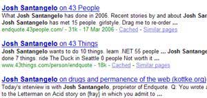 Santangelo lúc ấy là một kẻ thường xuyên “hoạt động về đêm” với mái tóc đỏ rực. Nhưng hiện chuyên gia phát triển web này đã trở nên nổi tiếng, luôn đóng bộ chỉnh tề và có mặt tại các cuộc hội thảo đúng giờ. Khách hàng của Santangelo gồm cả Walt Disney, Nickelodeon, Starbucks, AT&T và Microsoft. Nếu gõ từ khóa "Josh Santangelo" trên dịch vụ Google, mọi người có thể đọc những thông tin trên, kể cả đường dẫn có tiêu đề: "Josh Santangelo on drugs and..." (Santangelo sử dụng ma túy...).
