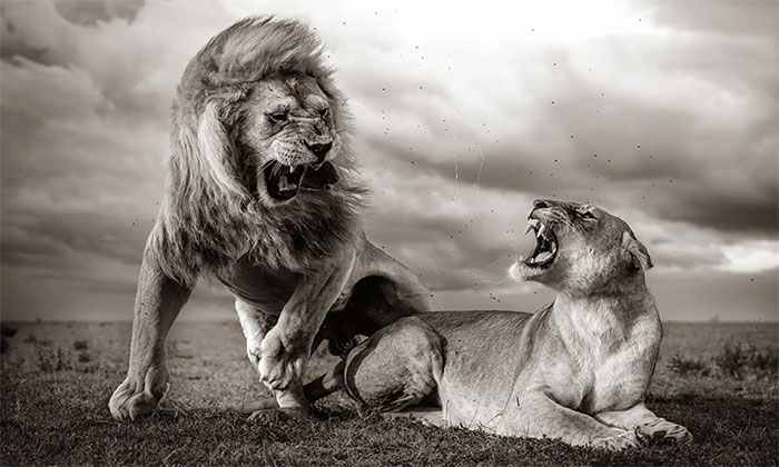 Bức ảnh này lưu lại khoảnh khắc căng thẳng giữa một con sư tử đực và cái ở Vườn quốc gia Serengeti sau khi sư tử cái bị gãy chân trong nỗ lực giao phối của con đực. Vệt nước bọt từ miệng hai con mèo lớn và đám ruồi bay ra từ bờm sư tử đực tăng thêm sự kịch tính cho khung hình. Cả hai là những chi tiết nhiếp ảnh gia người Anh William Fortescue không chú ý cho tới khi phóng to bức ảnh sau đó. (Ảnh: William Fortescue)