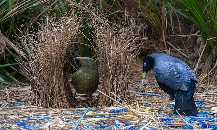 Bức ảnh nêu bật tập tục ghép đôi của chim đinh viên satin đực chuyên xây tổ để thu hút con cái. Đây thực chất là hai khung hình chồng lên nhau. Một là lúc chim đực tập trung vào xây tổ và một là chim cái ghé thăm. Đáng chú ý là cách chim đực trang trí tổ bằng kẹp quần áo nhựa, ống hút, nắp hộp carton, hé lộ cách loài chim này thích nghi với môi trường đô thị. Bức ảnh được chụp bởi nhiếp ảnh gia Keith Horton đến từ Australia. (Ảnh: Keith Horton)