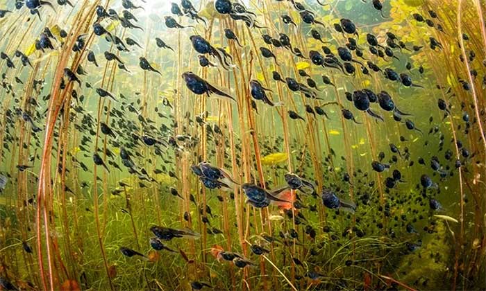 Nhiếp ảnh gia Shane Gross đến từ Canada chụp bức ảnh đạt thứ hạng cao nhất trong cuộc thi sau khi lặn ở hồ nước trên đảo Vancouver suốt vài giờ. Cuộc di cư kỳ vĩ của những con nòng nọc nhỏ xíu là cảnh tượng mà phần lớn mọi người không thể tưởng tượng. (Ảnh: Shane Gross)