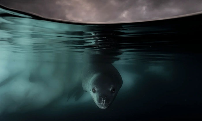Nhiếp ảnh gia Matthew Smith đến từ Australia chụp ảnh hải cẩu báo bên dưới lớp băng ở cảng Paradise trên bán đảo Nam Cực. Đây là lần đầu tiên ông đối mặt trực tiếp với loài vật này. "Khi nó nhìn thẳng vào ống kính, tôi biết đây sẽ là một bức ảnh đẹp", Smith chia sẻ. (Ảnh: Matthew Smith)
