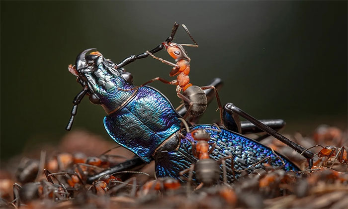 Bức ảnh ấn tượng của nhiếp ảnh gia người Đức Ingo Arndt ghi lại khoảnh khắc một con kiến gỗ đỏ giúp đồng loại xẻ xác bọ đất xanh. (Ảnh: Ingo Arndt)