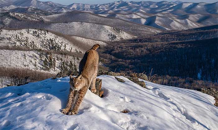 Hình ảnh con linh miêu vươn mình dưới ánh Mặt trời buổi chiều tối được nhiếp ảnh gia Igor Metelskiy người Nga ghi lại. Ông mất gần 6 tháng để chụp ảnh loài vật ẩn dật này. (Ảnh: Igor Metelskiy)