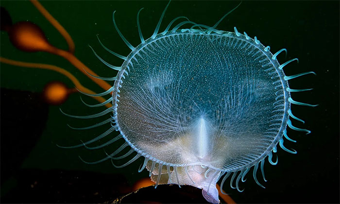 Bức ảnh của nhiếp ảnh gia Sage Ono người Mỹ chụp hình sên biển đầu sư tử với phần miệng và nắp chụp mở rộng để bắt mồi. Nó nằm trên một nhánh lá tảo chờ thức ăn như động vật giáp xác hoặc loài động vật không xương sống khác bơi ngang qua và mắc vào nắp chụp. Sau đó, nó sẽ khép miệng lại và nuốt chửng con mồi. (Ảnh: Sage Ono)