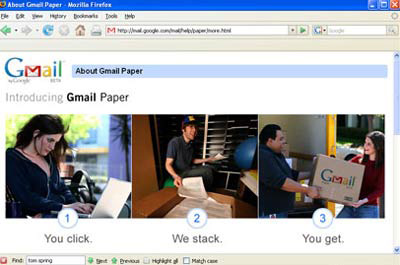 Ngày Cá tháng 4 năm ngoái, hãng này giới thiệu dịch vụ Google Paper, cho phép mọi người chỉ cần nhấn một nút là tất cả thư trong Gmail sẽ được in, phân loại, đóng hộp và được chuyển đến nhà họ. Thậm chí, Google khẳng định chương trình này sẽ ngăn chặn nạn phá rừng lấy gỗ sản xuất giấy để... in thư điện tử vì chất liệu mà Google dùng có đến "96% là nước bọt".