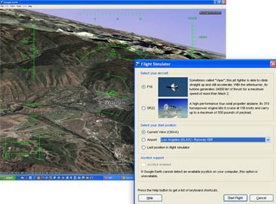 Người sử dụng có thể "bay lượn" trong Google Earth bằng cách mở dịch vụ này và nhấn tổ hợp phím Ctrl-Alt-A. Họ sẽ có cảm giác như đang ngồi trong khoang lái của máy bay F16 hay SR22.
