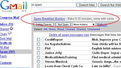 Mỗi khi mở mục Spam trong Gmail, người sử dụng có thể thấy một công thức nấu món... thư rác mới, chẳng hạn Spam Quiche hay Spam Tortilla Sandwich...