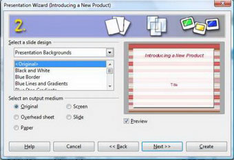 Một trong những chức năng thuận tiện nhất của OO là trình thuật sĩ hướng dẫn chi tiết từ tạo bảng biểu, làm slide, v.v.. Các hướng dẫn tận tay dành tới người dùng thông thường này khá thiết thực, ví dụ như bạn sẽ được hỏi dùng máy chiếu loại nào trước khi bắt tay vào dựng slide như hình dưới.