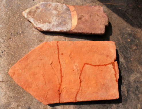 Ngói móc có kích thước lớn, loại vật liệu xây dựng đặc trưng của nền văn hóa Chămpa được tìm thấy ở khu gò Trường Cửu. (Ảnh: Đinh Bá Hòa)