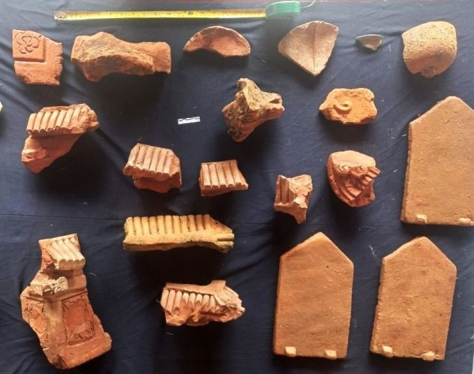 Đoàn khảo sát tìm thấy hơn 500 hiện vật đất nung gồm: Tháp nhỏ, ngói, vật liệu trang trí, gốm sứ gia dụng. Trong đó có mảnh tháp gắn hình đầu rồng và 400 mảnh ngói vỡ hình mũi nhọn, ngói mũi sen, mang đặc trưng trang trí thời nhà Trần, thế kỷ 13-14. Đặc biệt, có mảnh gạch ốp mỏng trang trí hoa chanh, hoa cúc và hoa dây trên bề mặt.