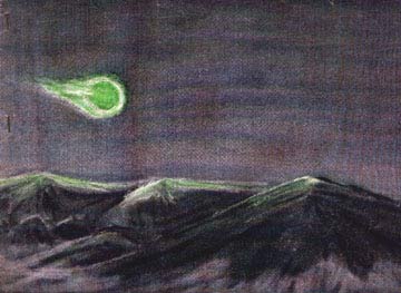 Bức tranh vẽ quả cầu lửa xanh bất ngờ xuất hiện trên bầu trời đêm New Mexico trên tạp chí LIFE số ra ngày 7/4/1952 (Ảnh: Answers) |