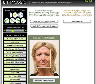 Trang web “Lift Magic” giúp các khách hàng tiềm năng có thể nhìn thấy viễn cảnh gương mặt của họ sau ca phẫu thuật thẩm mỹ, nhờ đó mà họ biết họ sẽ trông thế nào sau khi được cắt bỏ bọng mắt, phẫu thuật mũi hoặc phẫu thuật căng da mặt...