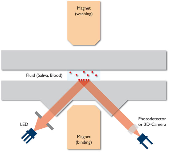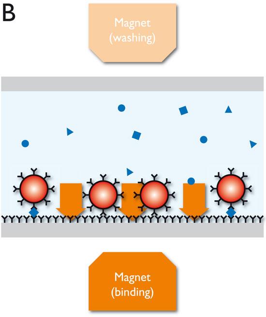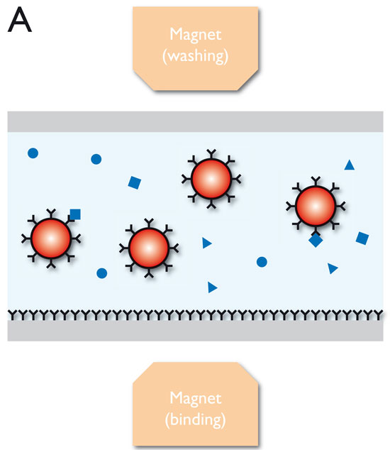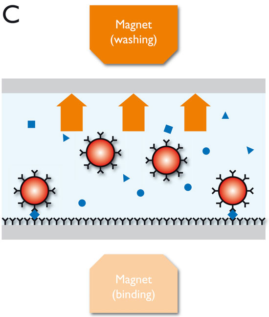 Một tấm từ nhỏ đặt bên dưới đầu lấy mẫu sẽ tạo ra từ trường đủ mạnh để hút các tinh thể nano từ tính về bề mặt cảm biến biosensor. Tại đây, các phân tử protein sẽ được bọc thêm 1 lớp phân tử thông tin thứ 2.