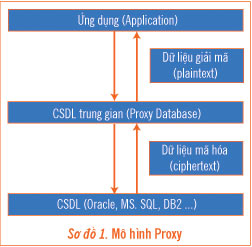 Trong mô hình này, một CSDL trung gian (proxy) được xây dựng giữa ứng dụng và CSDL gốc (Sơ đồ 1). CSDL trung gian này có vai trò mã hóa dữ liệu trước khi cập nhật vào CSDL gốc, đồng thời giải mã dữ liệu trước khi cung cấp cho ứng dụng. CSDL trung gian đồng thời cung cấp thêm các chức năng quản lý khóa, xác thực người dùng và cấp phép truy cập.