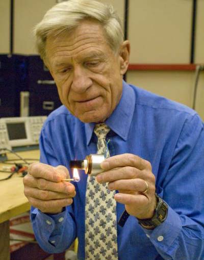 Nhà vật lý trường đại học Utal Orest Symko bật lửa cho một động cơ nhiệt nhỏ, động cơ này tạo ra âm thanh có âm lượng lớn bằng cách chuyển nhiệt thành âm thanh. Nhóm nghiên cứu của ông Symkodđang kết hợp các động cơ nhiệt với công nghệ hiện tại, công nghệ chuyển âm thanh thành điện, tạo ra các thiết bị có thể khai thác năng lượng mặt trời để sản xuất ra điện theo một cách mới, làm nguội máy tính vá các thiết bị điện tử khác. (Ảnh: Trường đại học Utal) |