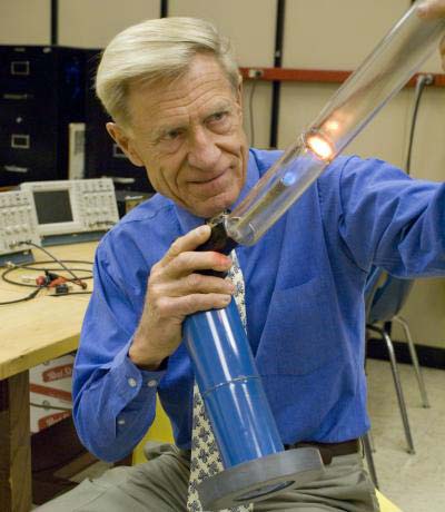 Giáo sư Symko đang trình bày thiết bị có khả năng chuyển nhiệt thành âm thanh và sau đó thành điện – một công nghệ mới hứa hẹn cho việc thu nhiệt bị thải ra trong các quy trình công nghiệp và chuyển lượng nhiệt thải này thành năng lượng điện. Trong bức ảnh này, giáo sư Symko sử dụng pin, không phải là để bật đèn sáng một cách trực tiếp mà là để nung nóng thiết bị trong tay ông. Thiết bị này sau đó chuyển nhiệt thành âm thanh nghe được và sau đó chuyển âm thanh thành dòng điện, dòng điện này làm cho bóng đèn sáng lên màu đỏ nhạt. (Ảnh: Trường đại học Utal) |