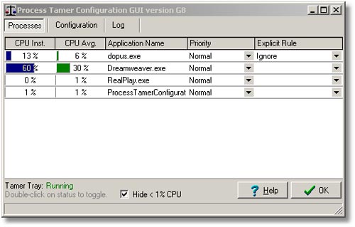 Sau khi cài đặt, bạn chạy chương trình từ menu Start -> Programs -> Process Tamer -> Process Tamer. Khi chạy, nó sẽ thể hiện biểu tượng tại khay đồng hồ và tự động thực hiện cân bằng hệ thống và bạn không cần phải điều chỉnh gì cả. Nếu bạn muốn sau này chương trình sẽ tự động chạy khi khởi động Windows thì hãy bấm phải vào biểu tượng của nó ở khay, chọn Configure, đánh dấu hộp Start with Windows rồi bấm OK là xong.