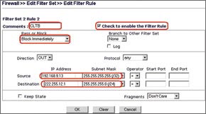 Tương tự việc ngăn chặn game trực tuyến, bạn có thể quản lý kết nối dựa vào địa chỉ IP của các máy tính trong mạng nội bộ. Một bộ lọc với khả năng tùy biến cao cho phép nhân viên quản trị mạng áp dụng chính sách theo ý muốn một cách đơn giản và hiệu quả. Ví dụ: các máy của phòng kế toán không được phép kết nối Internet. Địa chỉ IP của máy tính phòng kế toán là 192.168.9.34 và 192.168.9.35. Chúng ta sẽ thiết lập trong Data Filter, mục Filter Setup (Hình 4). Ngoài ra, chúng ta có thể ngăn chặn truy cập dựa vào cổng kết nối (port).