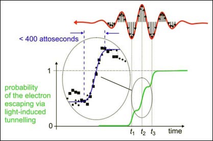 Điện trường mạnh từ một xung laser mạnh có thể khiến cho điện tử chui hầm ra khỏi nguyên tử chỉ trong thời gian một phần triệu-triệu giây.
