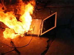 Quay trở lại ngày thứ 4, 21/6, vào lúc 13h22 phút, The Inquirer, một website chuyên đăng tải tin tức giật gân, lá cải về công nghệ của Anh đã công bố một chùm ảnh gây sốc cho thấy một máy notebook của Dell đang bốc cháy nghi ngút ngay giữa cuộc họp báo ở Nhật bản.