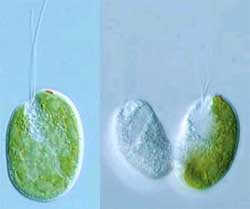 | Ở bên trái, sinh vật "Hatena" sở hữu một thân tảo lục như một vật cộng sinh, với một cái đuôi dính ra ngoài màng tế bào. Bên phải, Hatena phân chia thành hai tế bào con, một trong suốt và một được thừa kế vật cộng sinh xanh lục. Tế bào con trong suốt sẽ lại đi kiếm ăn, và "bắt cóc" một tế bào tảo mới. |