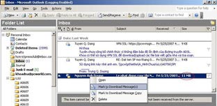 Để tải về một thư, bạn nhấn chuột phải lên tiêu đề thư đó, chọn Mark to download Message(s) hay Delete để xóa thư đó (Hình 1). Lặp lại cách đánh dấu với các thư còn lại. Sau đó, bạn thực hiện các thao tác tương tự như khi tải về tiêu đề thư, nhưng lần này là chọn Process Marked Headers. Bằng cách này, Outlook sẽ được chỉ dẫn cụ thể cần thực hiện tác vụ tải về những thư nào và xóa trực tiếp trên máy chủ dịch vụ những thư nào dựa trên mã đánh dấu mà người dùng đã dán lên mỗi thư điện tử.