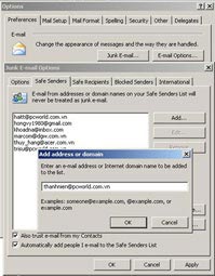 Song song với giải pháp tình thế đó, bạn còn có thể "thỏa hiệp" với Outlook bằng cách tạo ra một danh sách địa chỉ email người gửi an toàn (Safe Sender). Trong Outlook, bạn chọn Tools.Options, ở thẻ Preference, chọn Junk Email. Tiếp đến, ở thẻ Safe Senders, bạn đánh dấu 2 tùy chọn ở phía cuối hộp thoại là Also trust e-mail from My Contacts và Automatically add people I e-mail to the Safe Senders List. Bằng cách này, Outlook sẽ xem các địa chỉ thư điện tử có trong danh bạ liên lạc Contacts của bạn và những địa chỉ thư điện tử mà bạn gửi đi là những địa chỉ an toàn (không phải là địa chỉ phát tán thư rác). Ngoài ra, bạn cũng có thể bổ sung các địa chỉ thư điện tử khác vào danh sách Safe Senders (Hình 2).