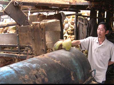 Máy tước chỉ xơ dừa chưa cải tiến, tốn nhiều nhân công, không đảm bảo an toàn lao động.