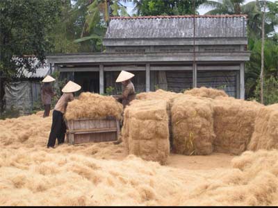 Bà con nông dân đang phơi, đóng chỉ xơ dừa thành kiện.