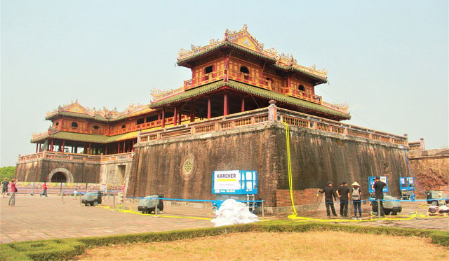 Di tích Ngọ Môn, cửa chính đi vào Hoàng Cung Huế đang hoàn tất những công đoạn cuối cùng của dự án làm sạch bằng kỹ thuật phun áp lực cao ở chế độ hơi nước nóng.