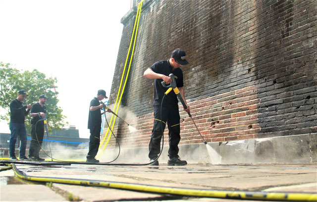 Các nhân viên đang tẩy rửa cổng Ngọ Môn bằng công nghệ mới.