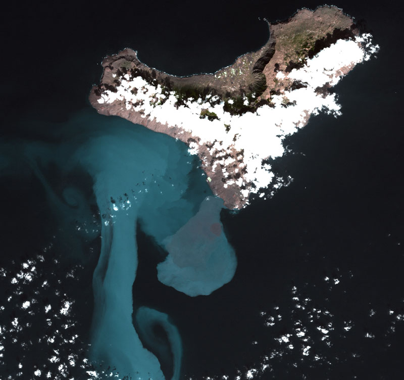 Một vụ phun trào núi lửa trong lòng biển ngoài khơi El Hierro, một trong những quần đảo của Tây Ban Nha, tạo ra những vệt màu xanh có thể là hỗn hợp giữa khí, đá bột và đá dưới đáy biển bị nghiền nát.