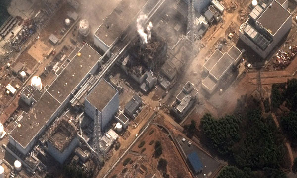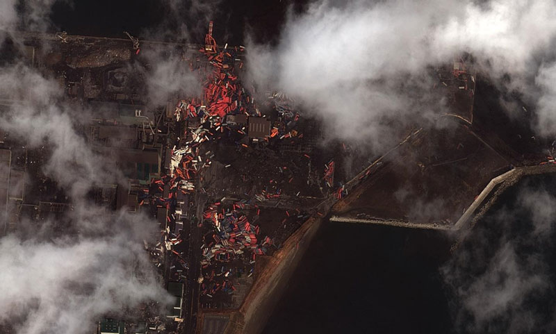 Hình ảnh nhà máy điện hạt nhân Fukushima Daiichi vào lúc 11h04 phú, giờ địa phương, chỉ 3 phút sau khi một vụ nổ đã phá hỏng lò phản ứng số 3. Do hệ thống làm nguội hỏng nên 1 loạt những sự kiện sau đó đã đẩy nước Nhật vào tình trạng khủng hoảng hạt nhân.
