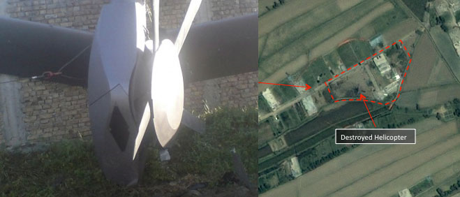 Hình bên trái cho thấy mãnh vỡ của chiếc trực thăng của quân đội Mỹ sử dụng trong chiến dịch tiêu diệt Osama bin Laden ngày 2/5. Những mãnh vỡ cùng loại được tìm thấy bên trong tường rào của dinh thự thủ lĩnh Al Qaeda tại Abbottabad trong hình bên phải. Ảnh do vệ tinh Ikonos của GeoEye chụp được.