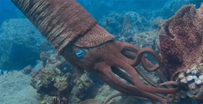 Nó vươn những chiếc xúc tu dài qua khe đá của rạn san hô và bắt thành công con mồi.