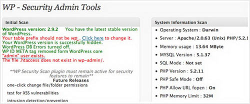 WP Security sẽ quét các phần cài đặt của Wordpress để tìm những lỗi bảo mật và đưa ra các đề xuất để bạn khắc phục. Plug-in còn kiểm tra mức độ an toàn của mật khẩu, quyền hạn truy cập tập tin, độ bảo mật cơ sở dữ liệu cũng như có tùy chọn để ẩn đi thông tin phiên bản của Wordpress ở trang chủ. Đây là chức năng hay mà trước nay các blogger thường phải thực hiện thủ công.