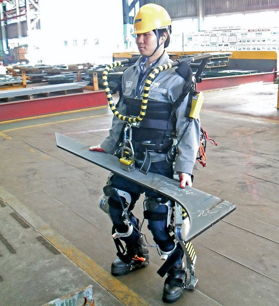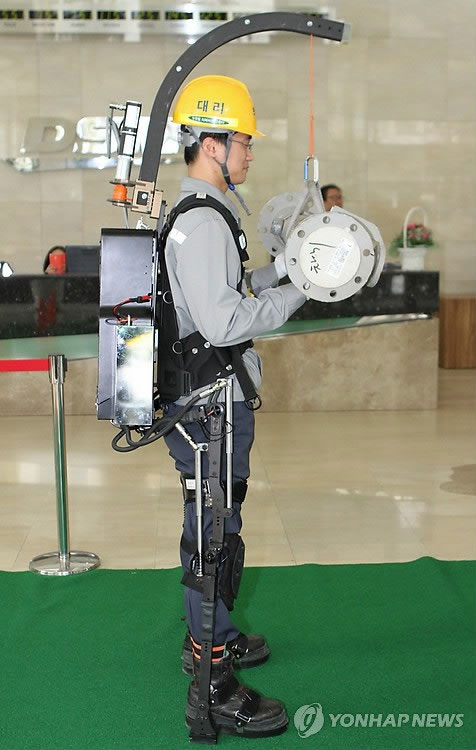 Bộ giáp thử nghiệm của Daewoo hiện đang được sử dụng thử tại nhà máy đóng tàu Okpo-Dong, Hàn Quốc. Theo tờ New Scientist, công nhân đóng tàu tại đây sẽ được trang bị một bộ giáp cơ khí bằng nhôm, thép và sợi carbon có tên "RoboShipbuilder" (Người đóng tàu Robot). Bộ giáp này có thể di chuyển được khối lượng của người mặc cộng với 30kg hàng hóa, cho phép công nhân tại Okpo-dong có thể di chuyển các vật thể nặng.