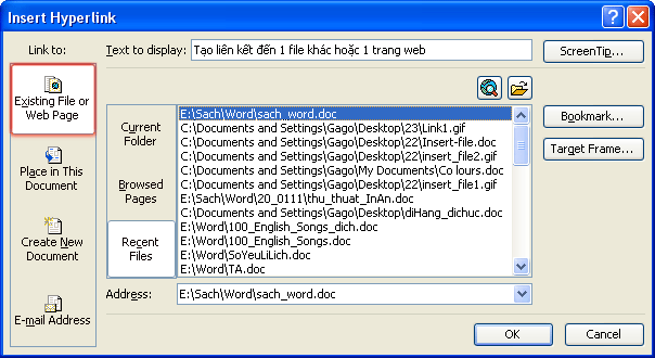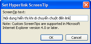 - Nút ScreenTip…: Nhập nội dung khi di chuyển chuột vào liên kết sẽ hiển thị nội dung đó (Giống việc chèn chú thích):