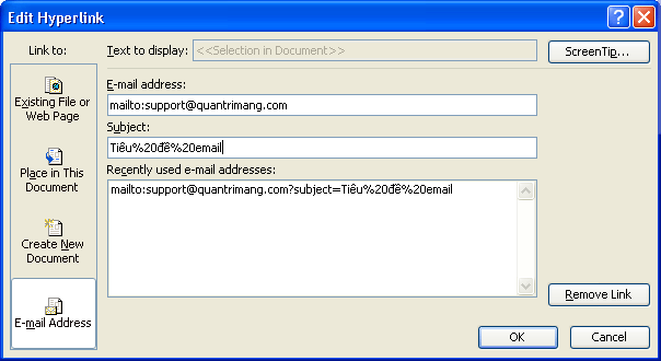 Nội dung Subject và E-mail Address sẽ hiển thị khi bạn di chuyển chuột vào liên kết.4. Chọn nút OK để hoàn thành.