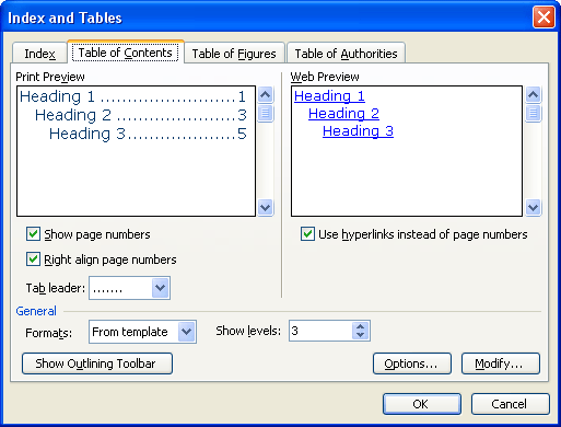 3. Xuất hiện hộp thoại Index and Tables, chọn thẻ Table of Contents