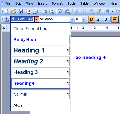 Từ Heading 4 trở đi sẽ không dùng tiếp được phím tắt như trên. Tuy nhiên có thể dùng tổ hợp phím Ctrl + Shift + S để vào hộp Style trên thanh Formatting, sau đó cùng phím mũi tên lựa chọn loại Heading.