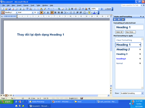 2, Trên màn hình sẽ xuất hiện panel Style and Formatting bên phải, chọn Heading1: