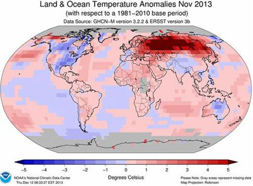 NOAA cho hay, phát hiện được dựa trên con số thống kê nhiệt độ trung bình trên đất liền và bề mặt đại dương vào tháng 11 trên phạm vi toàn cầu.